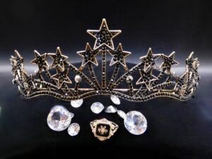 The Dark Star Tiara has an explosion of stars bursting from a unique curved base. Scattered black gems dot the entire piece giving the darkness dimension. The base is made of an antique brass material and has pin loops for stability.